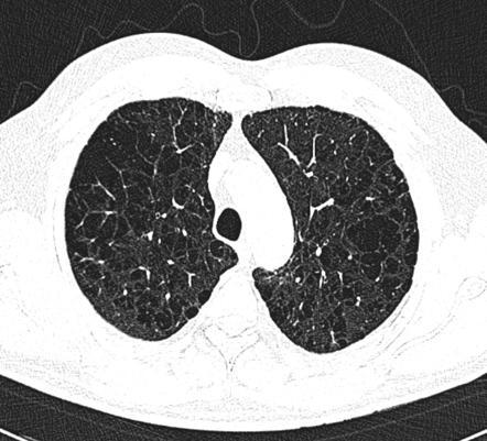 경계가 불분명한 저음영과 얇은 벽을 가진 기포, 폐혈관음영의 감소 등을 볼 수 있다.